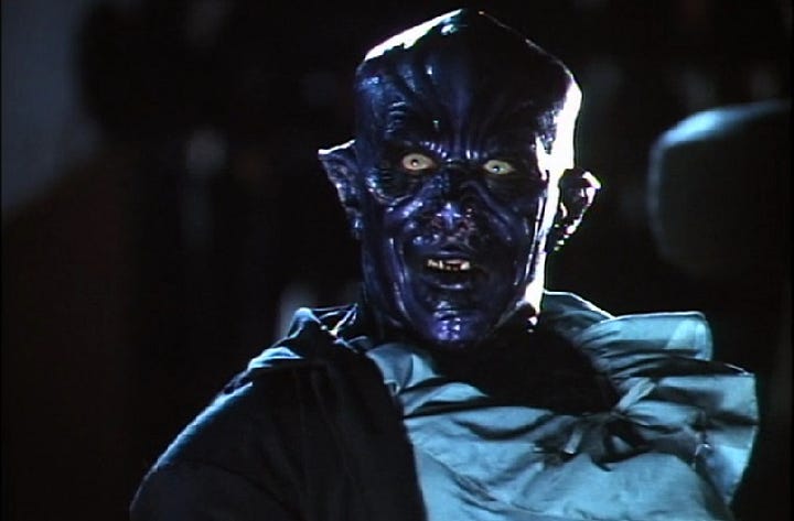 No CGI in sight. Pretty cool, right? Budget constraints required Bottin to use an air-pump system with condoms to create the bubble-effect. The bone-breaking sound-effect you hear is the unintended sound of the condoms popping against Richard Picardo’s skin. As you can, though, Bottin’s werewolves are feral, grotesque, and two-legged in contrast to his mentor’s four-legged, more animal-like werewolves in AAWIL. I dunno - there’s just something scarier about a werewolf on two legs.